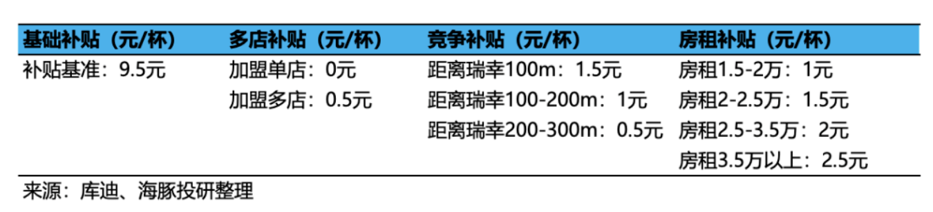 一位加盟商就透露,在去年Q4之前,使用9.9元券的产品瑞幸每杯补贴1元,但Q4之后改成以保证加盟商的单杯销售毛利(单价-原料成本)4元为基准,不满4元就补足4元。库迪没有选择跟进类似的补贴。