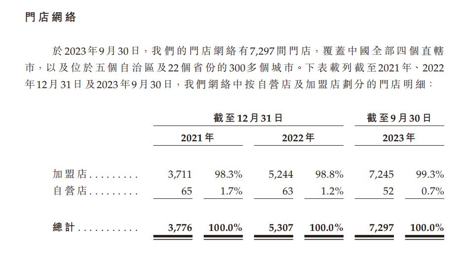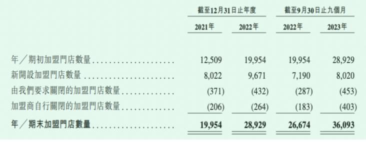 根据招股书,2021年至2023年前九个月,蜜雪冰城加盟商门店数分别为19954家、28929家和36093家。