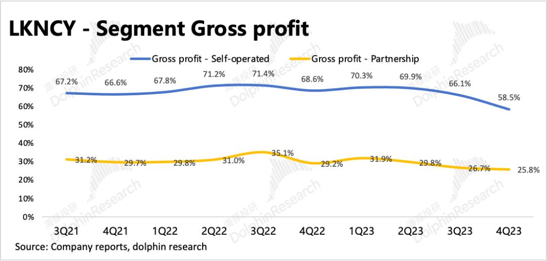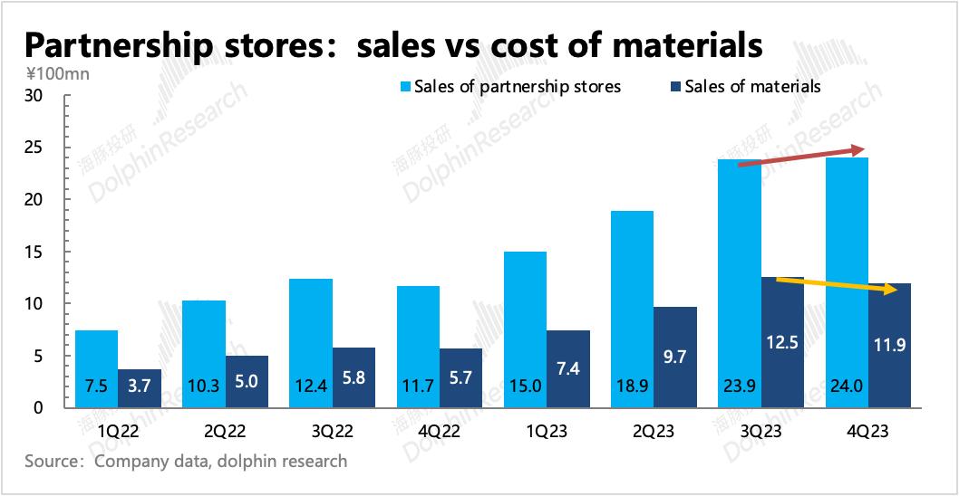 根据海豚君测算,四季度直营门店毛利率58.5%,环比下滑8pct,加盟门店毛利率25.8%,环比下滑1pct。