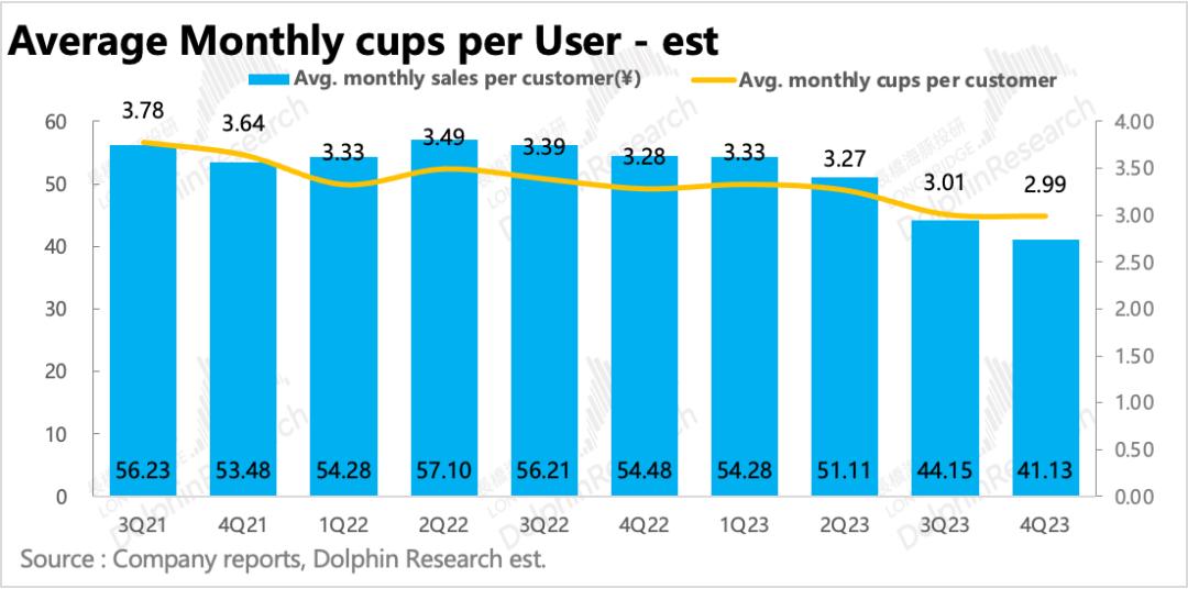 不过咖啡具有轻微成瘾性,从长期来看慢慢对新用户提高频次并不是多大问题。四季度人均月购买杯数同比下滑程度环比略微减轻,是一个好迹象,可以继续观察下。