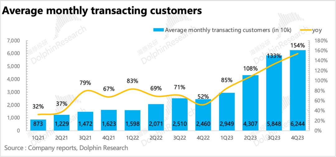 (3)四季度月均付费用户环比净增396万,达到6244万人,同比增速154%,基本上是由新增门店拉动。但如果看平均单店的交易用户数,四季度增速虽然有环比下滑,但仍然有38%的高增速,说明单纯从瑞幸咖啡用户的渗透以及后续更深度的消费习惯培养来看,远期还有空间。