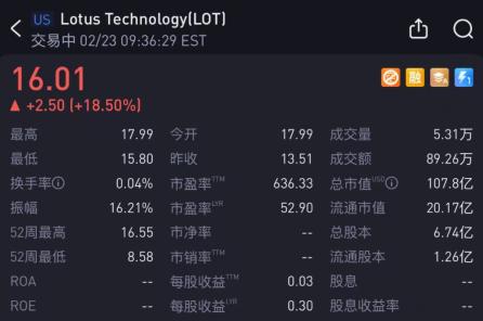 2月23日,路特斯美股上市,股票代码“LOT”。截至北京时间2月23日晚10点40分,路特斯股价一路上升至最高17.99美元/股,总市值达107.8亿美元(约合人民币776亿元)。