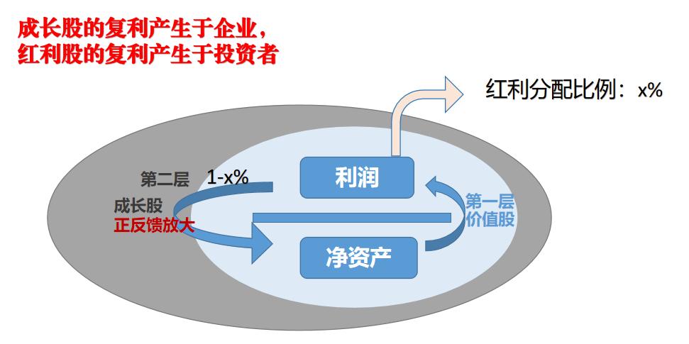 这一段非常重要,它实际上是红利股和成长股投资的最大的区别——成长股的复利产生于企业,红利股的复利产生于投资者。