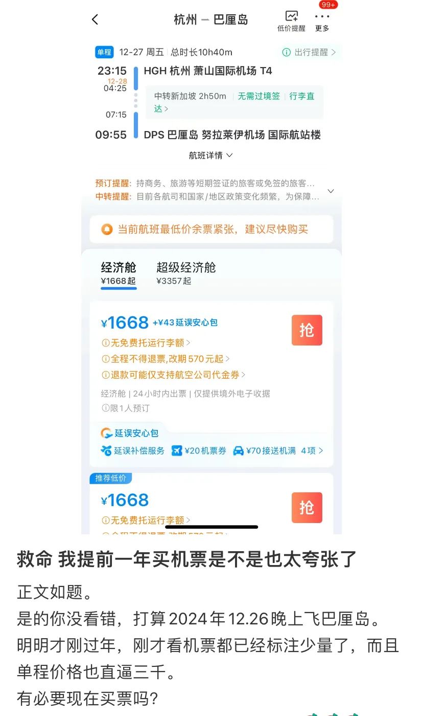 而付诸行动的消费者不在少数,近期“女子花1万6买好全年假期旅行机票”的热点话题下也有跟多人分享了相似的做法,即便不是全年,五一、十一的机票提前订已经成为越来越多消费者的选择。