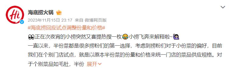 以海底捞为例,日前,海底捞因为有门店将此前价格为80元/整份和40元/半份的捞派脆脆毛肚调整到58元/份冲上微博热搜,当事门店回应称“因为顾客点半份比较多,所以门店首发实验,现在一份约等于之前的半份”。随后海底捞官方也给出回应:“半份菜并没有取消,考虑到消费者对小份菜的偏好,海底捞在个别门店试点,将原本半份菜的份量和价格来统一菜品供应规格。”