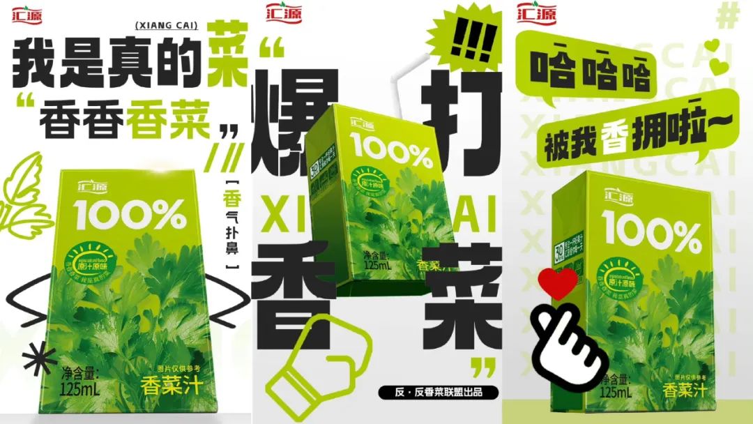 前不久,一向在大家眼里“成熟稳重”的汇源果汁推出了炸裂级饮料——100%香菜汁,纯绿色香菜包装再配上文案“香你的叶~多吸旺你能在我身边”话题度直接拉满。
