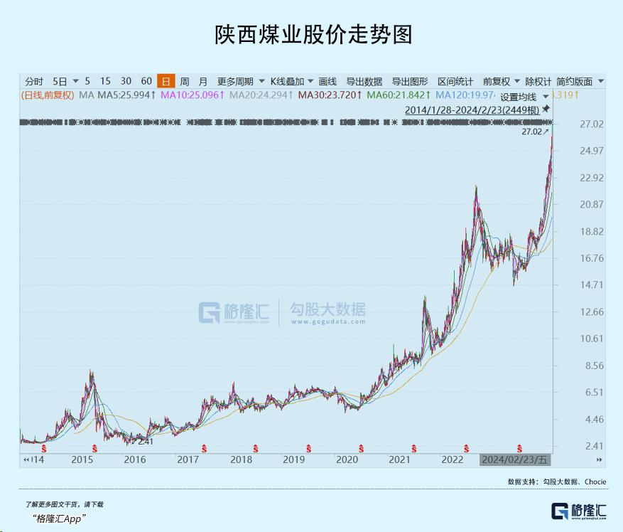 再看陕西煤业,更是不了得的存在。2016年2月2日至今,期间最大涨幅超过10倍。一个在陕西挖煤卖煤,处于夕阳产业的公司,过去被大家瞧不起,这些年却默默努力,最终实实在在地创造了不小的投资神话。