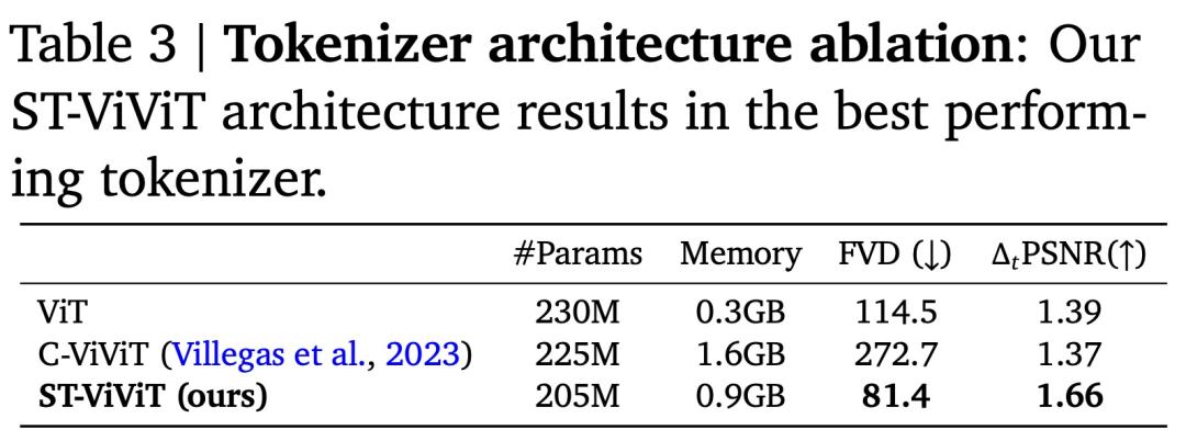 分词器架构消融。作者比较了三种分词器选择的性能,包括 1)(仅空间)ViT、2)(时空)ST-ViViT 和 3)(时空)CViViT(表 3)。