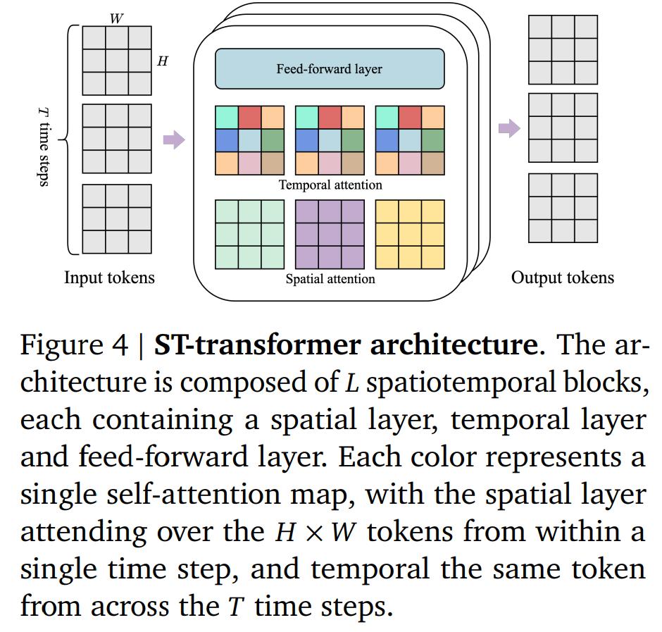Genie 架构中的多个组件基于 Vision Transformer (ViT) 构建而成。值得注意的是,由于 Transformer 的二次内存成本给视频领域带来了挑战,视频最多可以包含 𝑂(10^4 ) 个 token。因此,谷歌在所有模型组件中采用内存高效的 ST-transformer 架构(见图 4),以此平衡模型容量与计算约束。