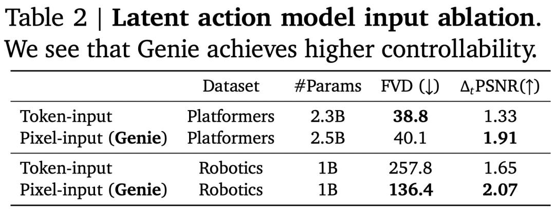 消融研究。选择在设计潜在动作模型时,作者仔细考虑了要使用的输入类型。虽然最终选择使用原始图像(像素),但作者在设计 Genie 时针对使用标记化图像的替代方案(在图 5 中用 z 替换 x)来评估这一选择。这种替代方法称为「token 输入」模型(参见表 2)。