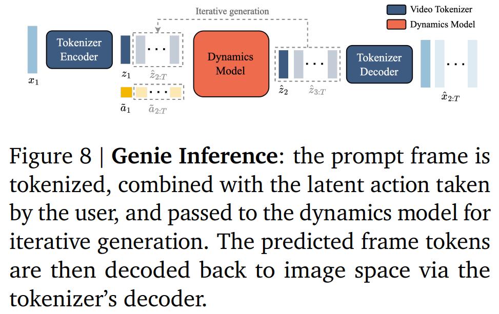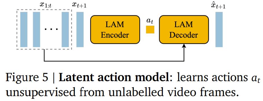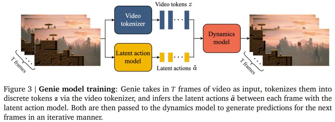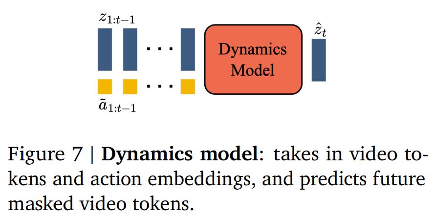 3) 动态模型,给定潜在动作和过去帧的 token,用来预测视频的下一帧。