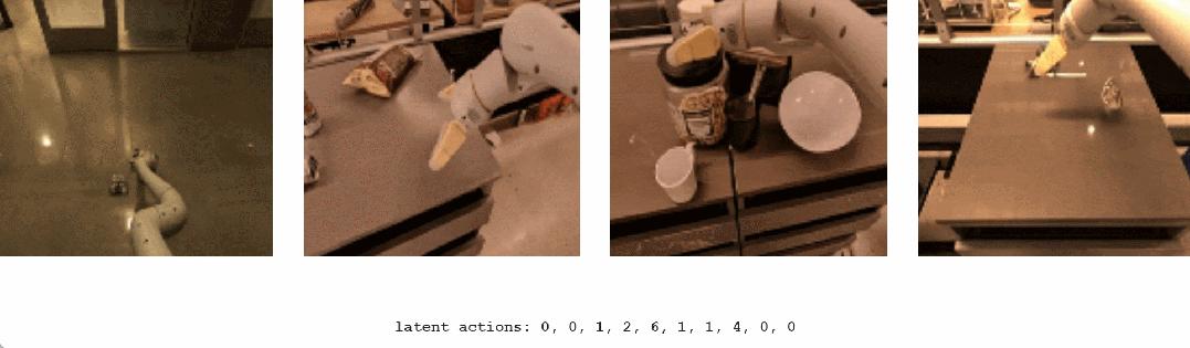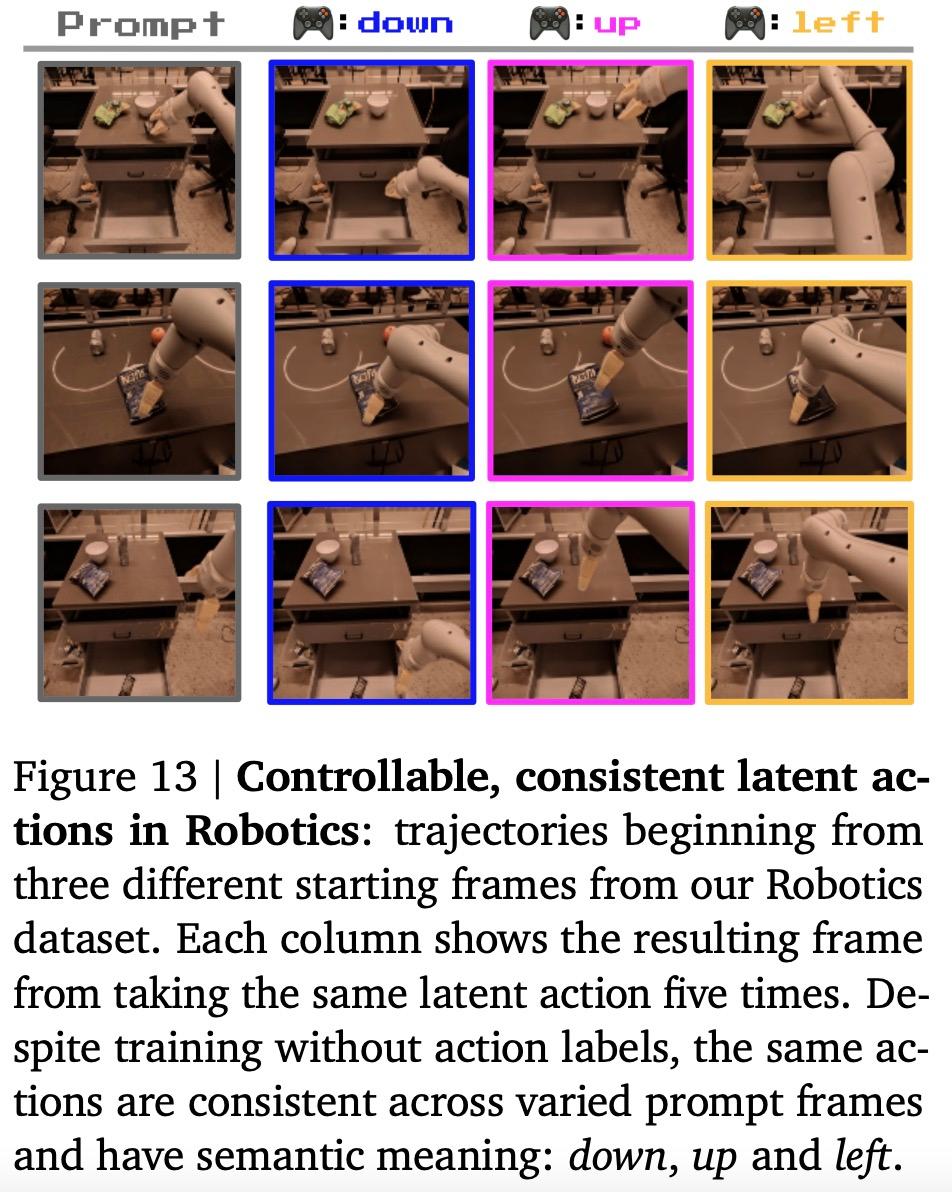 谷歌在 RT1 的无动作视频上训练了一个较小的 2.5B 模型。与 Platformers 的情况一样,具有相同潜在动作序列的轨迹通常会表现出相似的行为。
