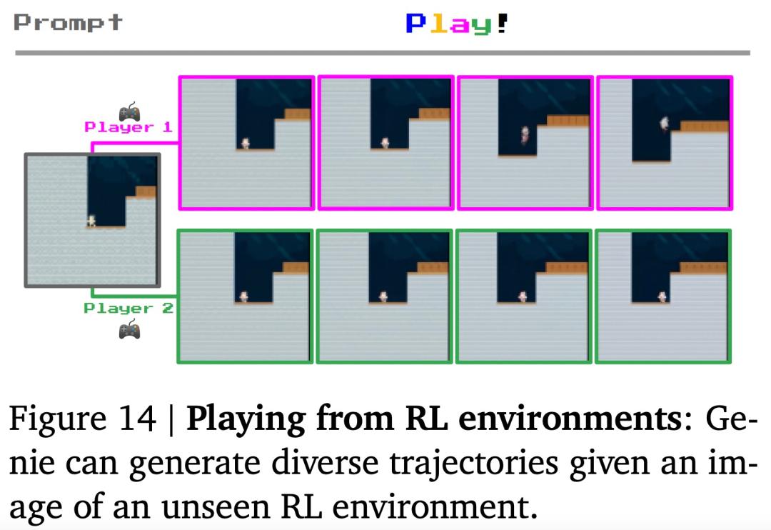 智能体训练。或许有一天,Genie 可以被用作训练多任务智能体的基础世界模型。在图 14 中,作者展示了该模型已经可以用于在给定起始帧的全新 RL 环境中生成不同的轨迹。
