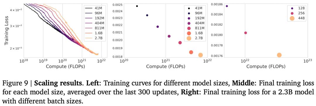为了研究模型的扩展行为,谷歌对参数量为 2.7B 到 41M 的模型进行了实验来探讨模型大小和批大小的影响,实验结果如下图 9 所示。