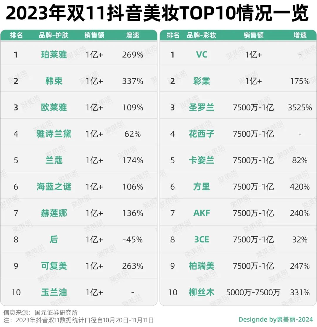 就从数据端来看,国货品牌在抖音渠道的增速明显高于海外品牌。如,2023年双11护肤类目中,韩束、珀莱雅和可复美增速分别达到337%、269%、263%。