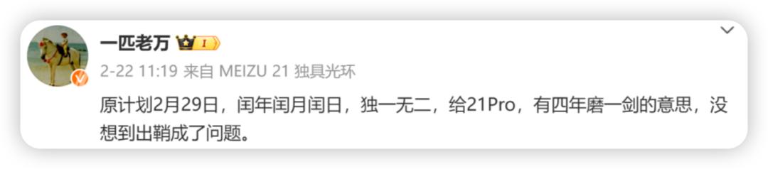魅族科技助理副总裁 @一匹老万 转发该消息并说到, “ 原计划 2 月 29 日,闰年闰月闰日,独一无二,给 21 Pro ,有四年磨一剑的意思,没想到出鞘成了问题。”