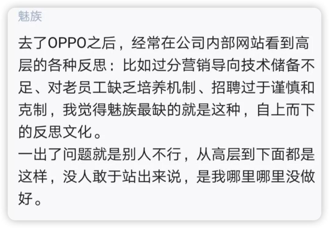 曾经有前员工在社群感慨:“去了 OPPO 后,经常在内部网站看到公司高层的各种反思..... 我觉得魅族最缺的就是这种,自上而下的反思文化。一出了问题就是别人不行,从高层到下面都是这样,没人敢站出来说,是我哪里哪里没做好。”