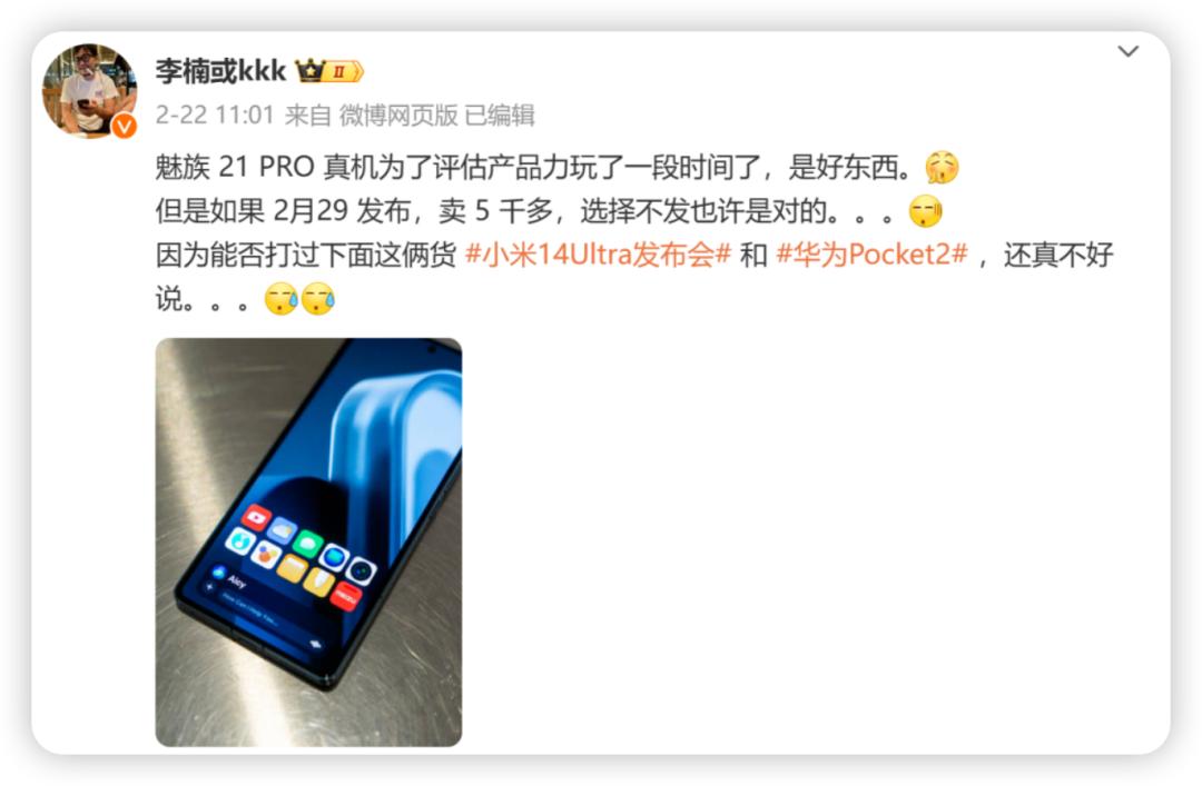 李楠表示:“ 魅族 21 PRO 真机为了评估产品力玩了一段时间了,是好东西。 但是如果 2 月 29 发布,卖 5 千多,选择不发也许是对的。 ”
