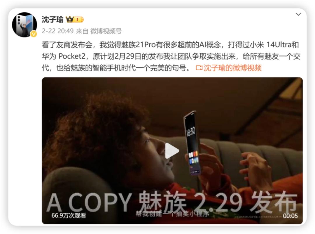 他在看完小米 14 Ultra 和华为 Pocket 2 的发布会后表示:“ 魅族 21 Pro 原计划 2 月 29 日的发布(会),会让团队争取实施出来,给所有魅友一个交代,也给魅族的智能手机时代一个完美的句号。”