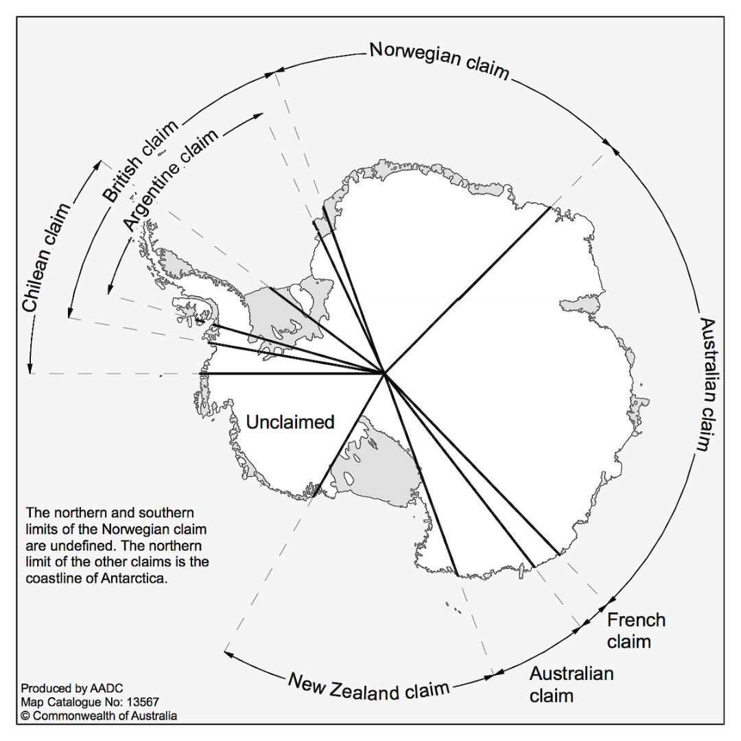 从 1820 年代首次被发现开始,南极大陆也经历了类似美苏太空竞赛的过程,先后有英国(1908)、新西兰(1923)、法国(1924)、挪威(1929)、澳大利亚(1933)、智利(1940)和阿根廷(1942)7 个国家正式对南极大陆提出过主权要求。直到 1959 年《南极条约》签订,协议国同意冻结一切对南极的领土要求。