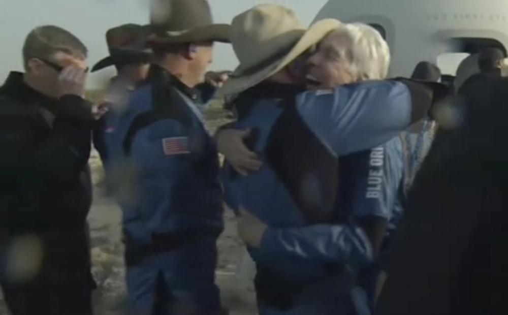 蓝色起源的商业航天飞行结束后,女飞行员沃利·芬克激动得与同伴拥抱|giphy