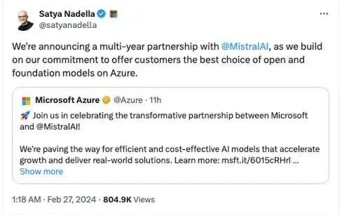 今天,微软突然宣布与法国开源大模型初创公司 Mistral 达成深度合作。