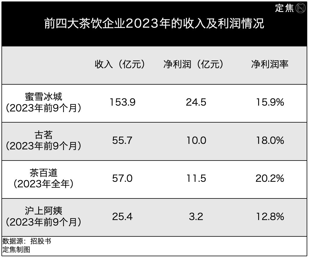 而招股书显示,不到三年时间(2021年、2022年、2023年前9个月),蜜雪冰城累计盈利超过64亿元;同期,古茗、茶百道、沪上阿姨分别累计盈利14亿元、30亿元、6亿元。