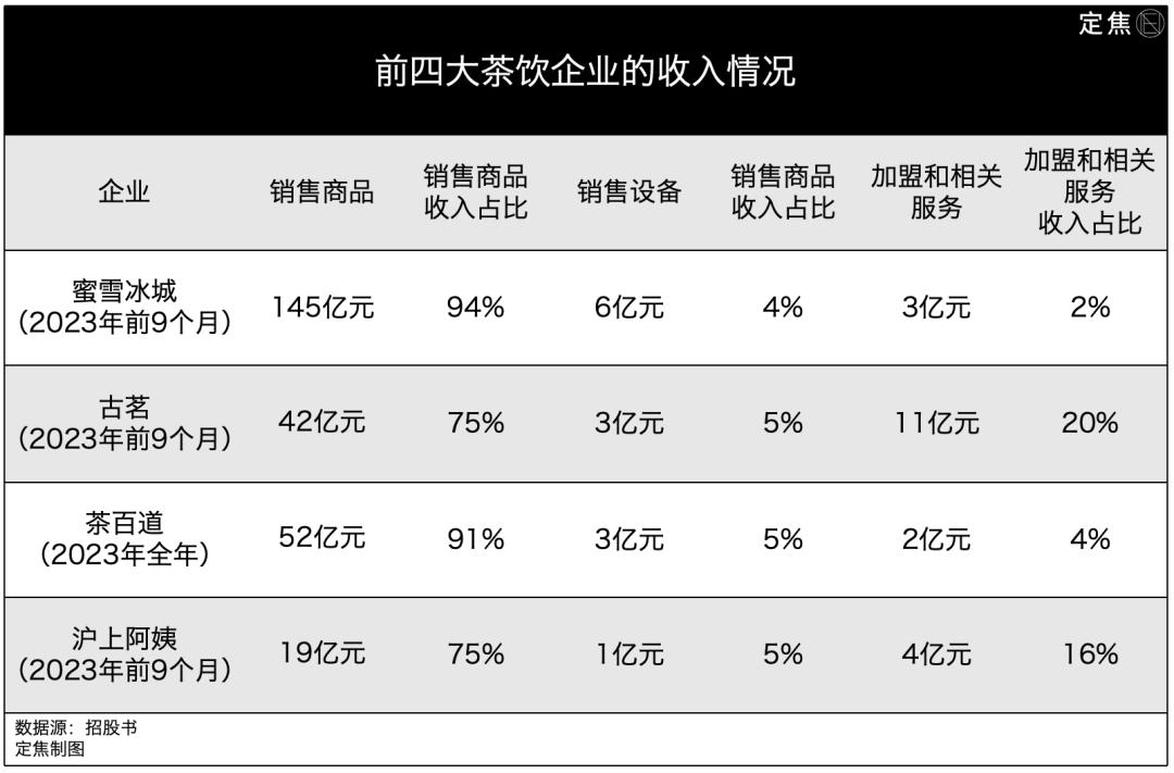 蜜雪冰城和茶百道,分别只有2%、4%的收入来自加盟费和相关服务费。古茗和沪上阿姨的加盟费占比稍高,分别达到20%、16%,但同样也不是大头。