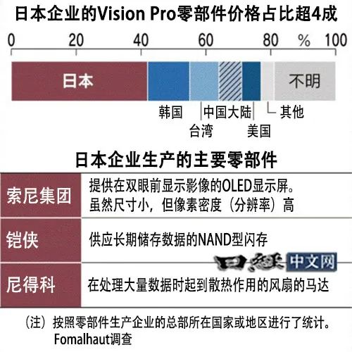 日本经济新闻(中文版:日经中文网)经过拆解调查发现,在美国苹果2月推出的眼镜型终端“Vision Pro”使用的零部件中,按价格计算,42%由日本企业供应。该终端采用了索尼集团的显示屏和铠侠(Kioxia)的存储器,按国家或地区来看,日本力压韩国、台湾和中国大陆排在第1位。