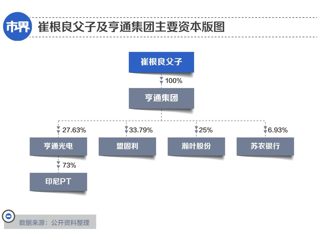 目前,亨通集团控制着4家上市公司,且为苏农银行的第一大股东,市值合计超500亿元。这些公司中,不仅有老牌光纤龙头亨通光电,还有崔根良最近几年不断收于麾下的锂电池材料供应商盟固利,农兽药厂商瀚叶股份,以及印尼上市的PT VOKSEL ELECTRIC TBK,并共同组合出亨通集团。