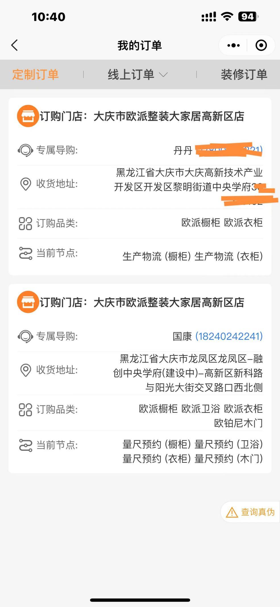 消费者丹丹在欧派家居集团小程序查到的订单