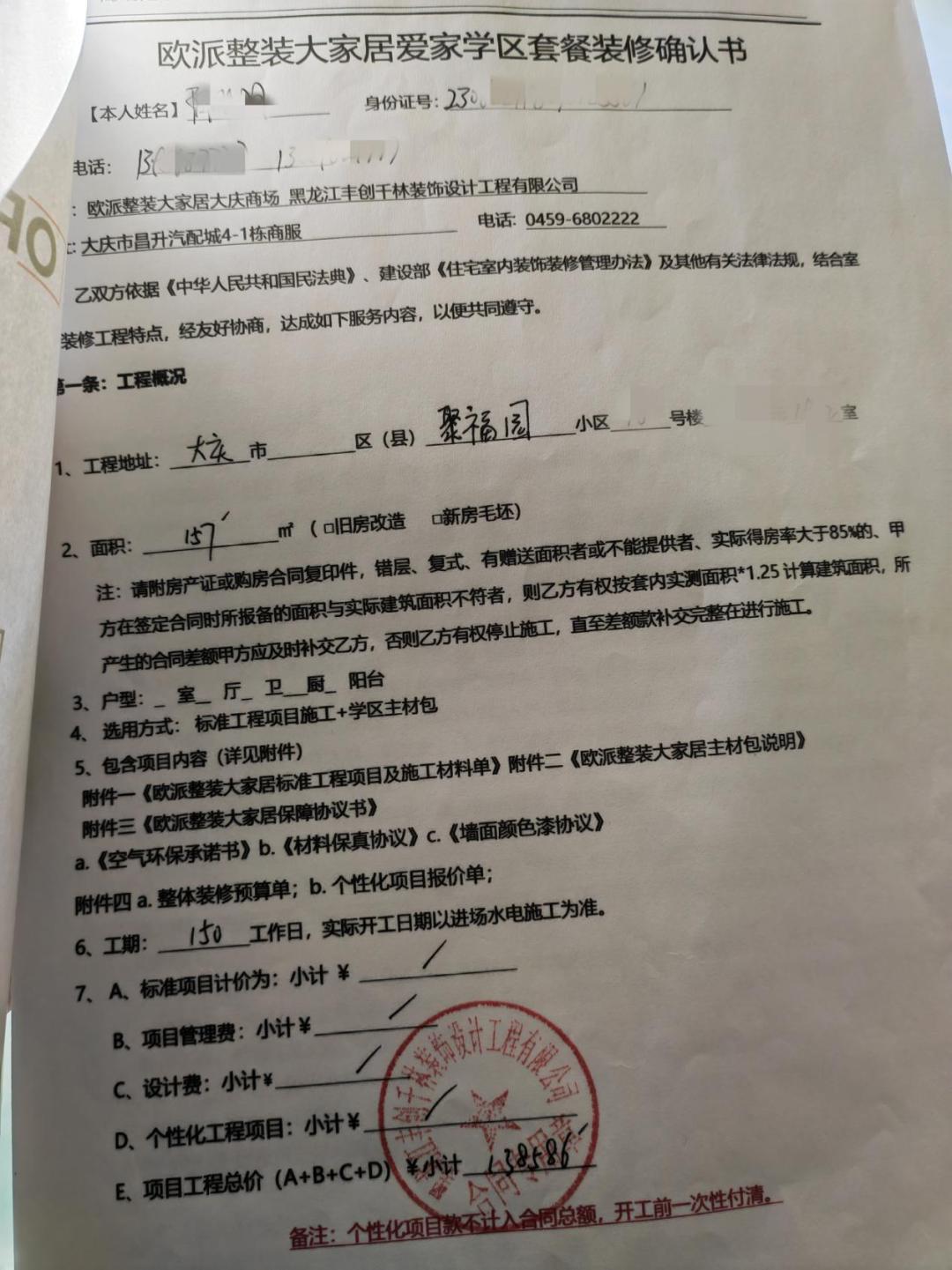 2023年8月份,朱晓莉在锦江公馆买房后,在邻居推荐下来到了“欧派整装大家居千林装饰”门店,9月2日,还参加了欧派家居总部来人开的全国战略样板间征集签约会。“其实当时我们还有别的选择,也去我们大庆本地很有名的非凡装饰看过,那边的报价也比这里低,但是公婆认为欧派家居在全国都很有名气、实力更有保障,设计师告诉我年底就能完工,承诺装修后全屋零甲醛,拎包可入住,所以最终还是选择了欧派。”朱晓莉告诉记者,她最终签约合同的总价是18.8万元,已经交了12万元,“其中有11万元都是贷款,现在每个月还要还2880元。”
