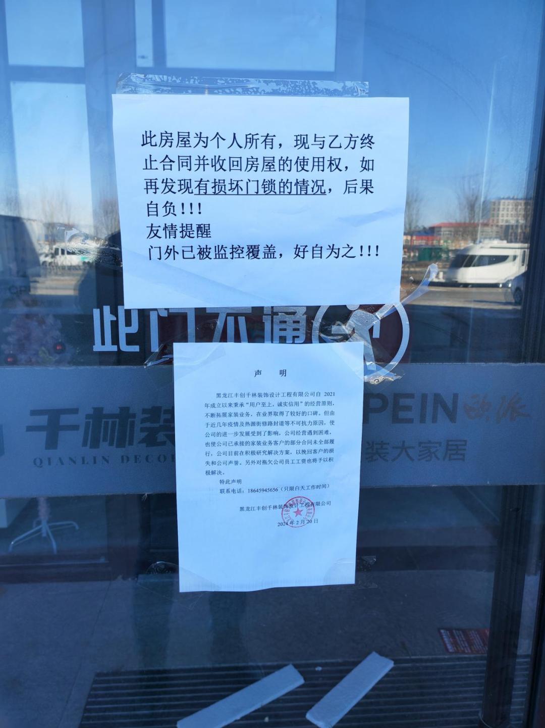 此外,大门上还张贴了一份声明称,黑龙江丰创千林装饰设计工程有限公司自2021年成立以来秉承“用户至上,诚实信用”的经营原则不断拓展家装业务,在业界取得了较好的口碑。但由于近几年疫情及热源街修路封道等不可抗力原因,使公司的进一步发展受到了影响,公司经营遇到困难也使公司已承接的家装业务客户的部分合同未全部履行,公司目前在积极研究解决方案,以挽回客户的损失和公司声誉。另外对拖欠公司员工工资也将予以积极解决。