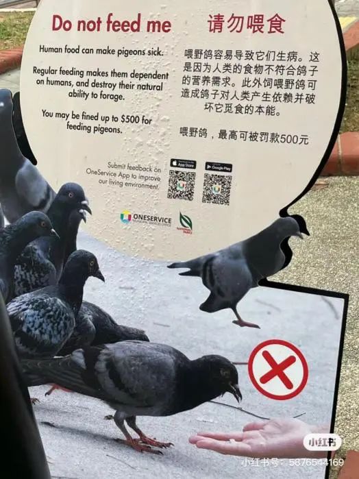 都知道新加坡生态极佳,随处可见鸽子、溜达鸡、溜达猴、溜达野猪、水獭、鳄鱼等。但都不能喂食,否则可被罚款500新币,也有地方会挂上罚款10000新币的牌子,相当于5.35W人民币。