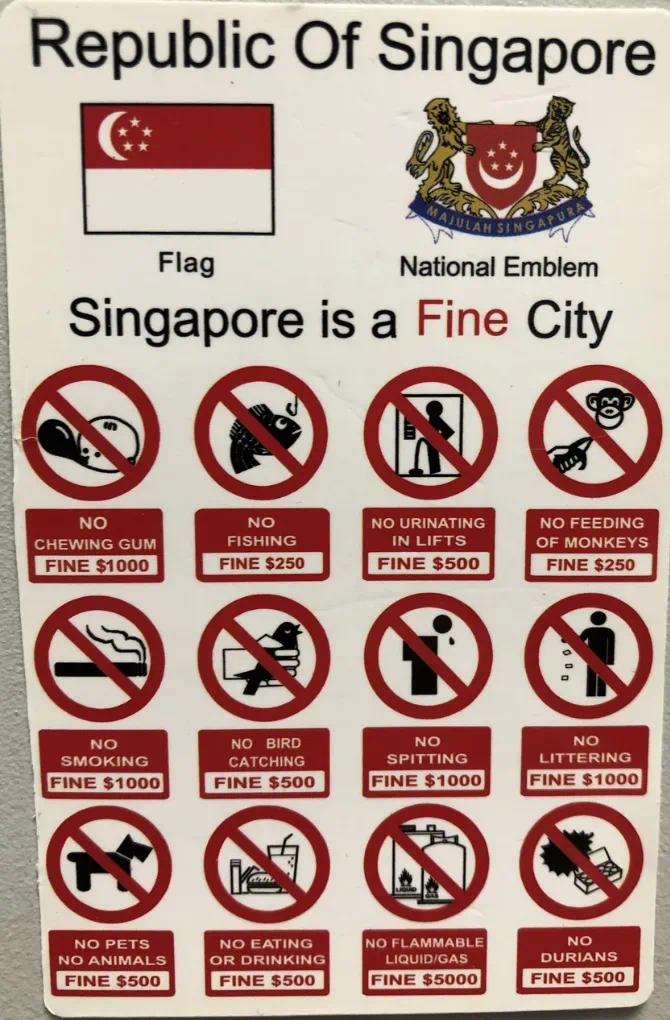 其他的还有诸多罚款条款,包括随地吐痰、随地扔垃圾、卖口香糖、不冲厕所、在自己家裸体、带榴莲进酒店、租屋养猫……通通都是被罚的结局。