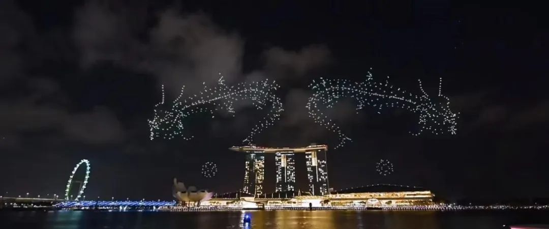 这次龙年春节,新加坡趁着免签的顶流势头,拿出了最大的诚意,春节期间在滨海湾金沙和城市天际线上空,举行了大规模无人机灯光秀,金龙、鲤鱼、龙门轮番上演,纯纯科技与狠活版的“难忘今宵”。