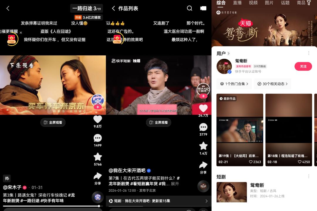 从入局的品牌来看,互联网平台依然是短剧的投放大户,比如天猫独家冠名了快手三部春节短剧《我在大宋开酒吧》《鸳鸯断》《超能坐班族》,宋木子主演的短剧《一路归途》背后有京东汽车独家冠名。
