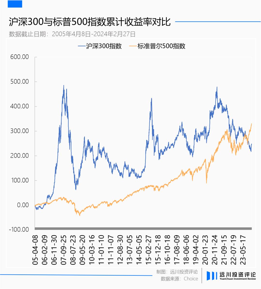 一个被大部分投资者忽略的客观事实是,以2005年沪深300指数推出为起点,一直到今年2月底,大部分时间里沪深300指数的累计收益率都要高于标普500。但在这近19年时间里,真正让投资者觉得A股比美股更容易赚钱的时间却屈指可数。