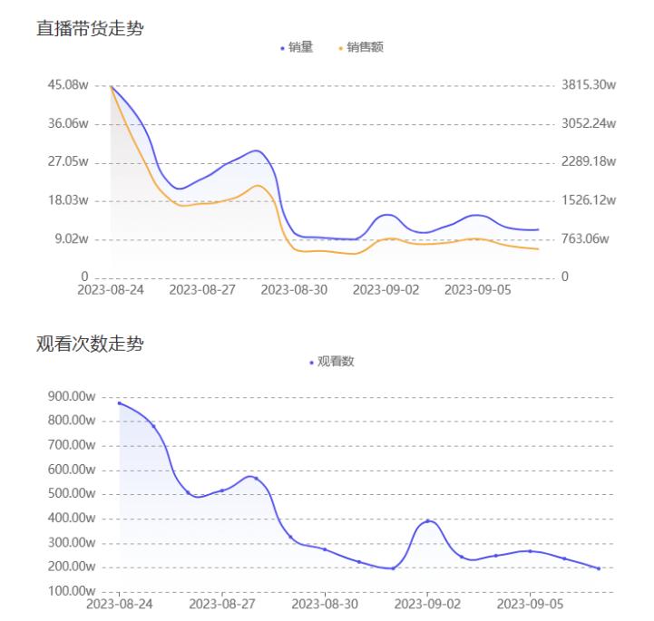 如刘伟所言,以东方甄选为例,去年8月东方甄选淘宝首秀成绩单虽达到1.75亿元,但据红人点集数据显示,不管是带货销量、销售额还是观看次数,东方甄选直播间都呈现出明显下滑趋势。