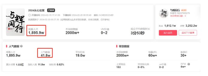 消费者的这份情感共鸣,叠加董宇辉的个人才华,让“与辉同行”直播间始终保持高热度和高销售额。大年初十,“与辉同行”开工首播,就实现了观看人次超1895万,带货销售额超2000万的成绩,霸榜直播带货排行榜第一。