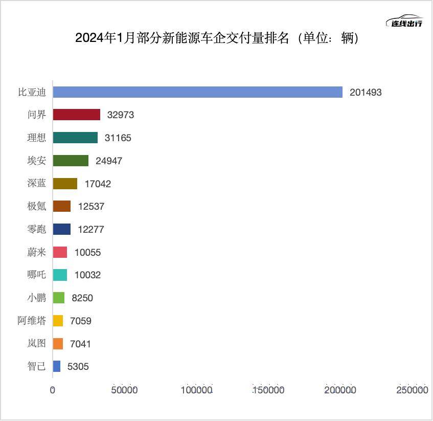 2024年1月部分新能源车企交付量排名,连线出行制图