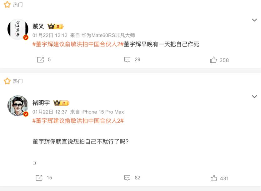 在“董宇辉建议俞敏洪拍中国合伙人2”的热搜话题下,相关热门互动颇带嘲讽之意,如“董宇辉早晚有一天把自己作死”、“董宇辉你就直说想拍自己不就行了吗?”。