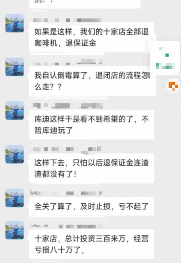 甚至有开了十家店的库迪联营商在微信交流群中直言,“经营亏损八十万了”“这样下去只怕以后退保证金连渣渣都没有”......
