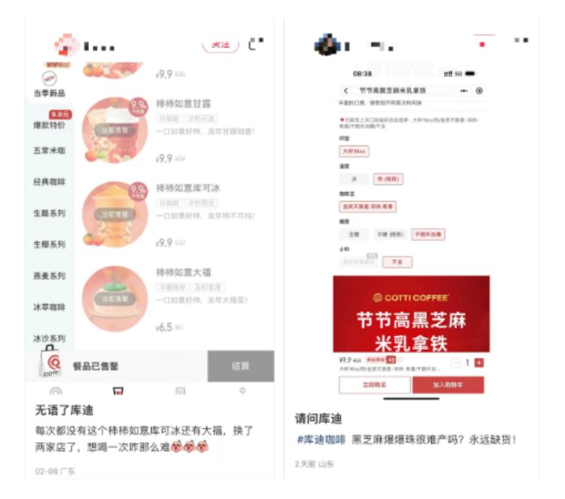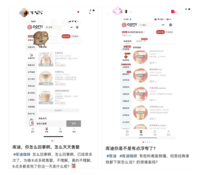 而在消费者端,问题主要体现在缺货上,有人表示像生椰拿铁、潘帕斯蓝等主打产品,库迪都总是缺货,吐槽道“8点多都卖完了,你这一天还卖什么呢?”;近期更是有消费者在小红书上抱怨,附近的库迪门店居然连经典拿铁都显示缺货......