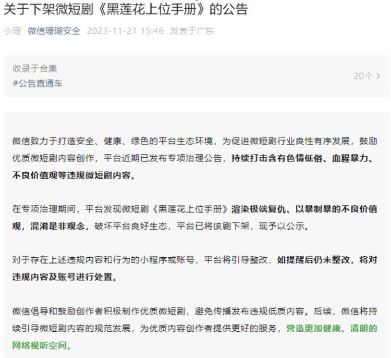 之后,抖音、快手、微信等平台也立马发布各自打击违规微短剧的公告,据互联网消息,公告发布后一段时期各类平台共下架短剧3.17万部。
