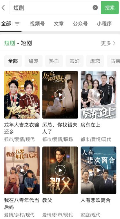 除了腾讯视频和阅文,我们注意到在微信顶部搜索“短剧”关键词会得到一个新的专栏,是多平台短剧内容的聚合界面,点击作品后将进入短剧小程序。这说明短剧已经被微信认为是一个内容品类进行专门化运营,微信搜一搜等生态入口也或将成为短剧的重要宣发阵地。