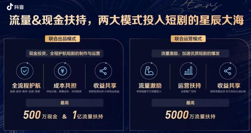 抖音早在2024年1月19日发布精品微短剧“辰星计划”,宣布将给予精品微短剧创作者资金和流量扶持,影视公司、媒体机构、MCN机构及个人均可参与。来自全行业的优质内容创作者,可通过联合投资和联合运营两大模式与该计划合作,最高可获得500万现金和1亿流量扶持。