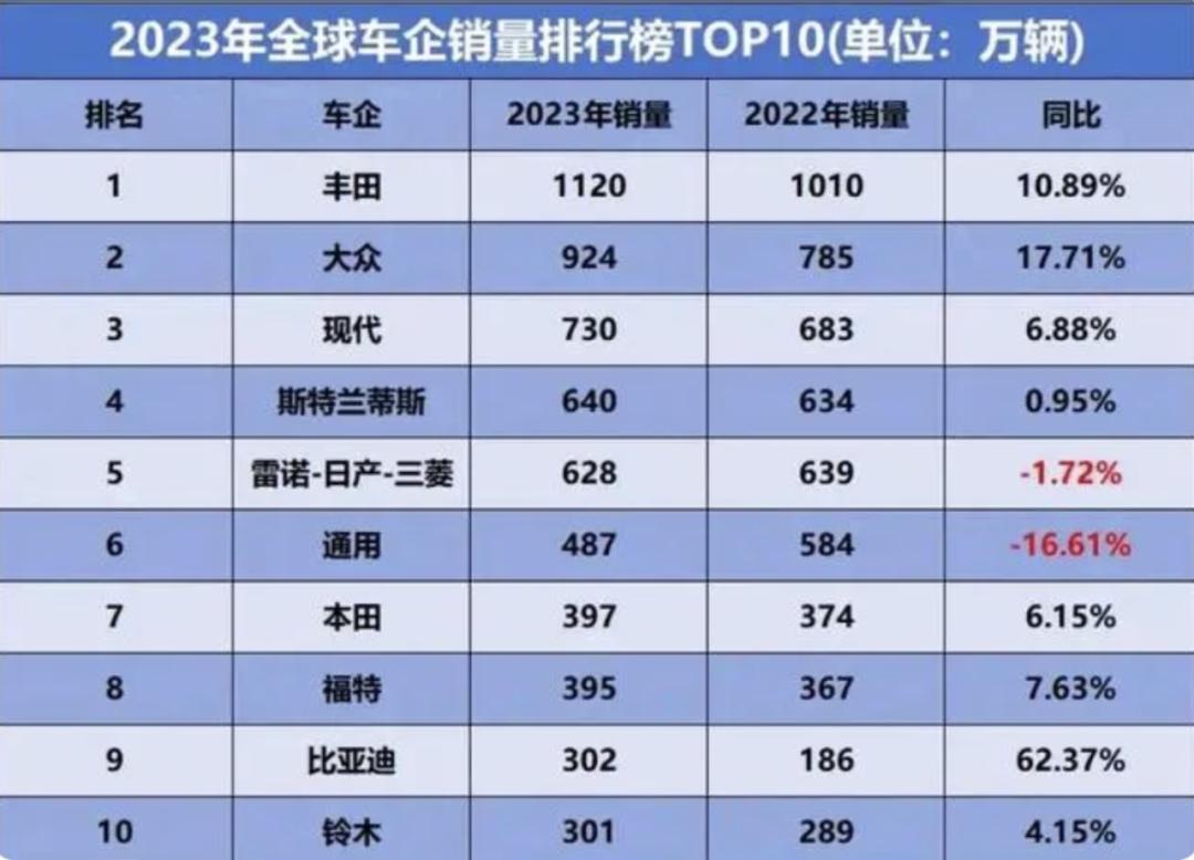 尽管如此,中国汽车依旧出口522.1万辆,成功超越日本,成为世界第一大汽车出口国,比亚迪也凭借超302万辆的销量表现,跻身全球第十大车企。值得一提的是,这是中国车企首次挤进全球车企前十的榜单。