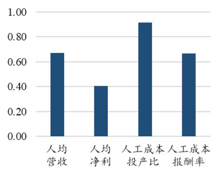 在零售行业中,人工成本投产比的行业竞争水平指数最高,人均营收与人工成本报酬率的行业竞争水平指数相当,人均净利行业竞争水平指数最小。