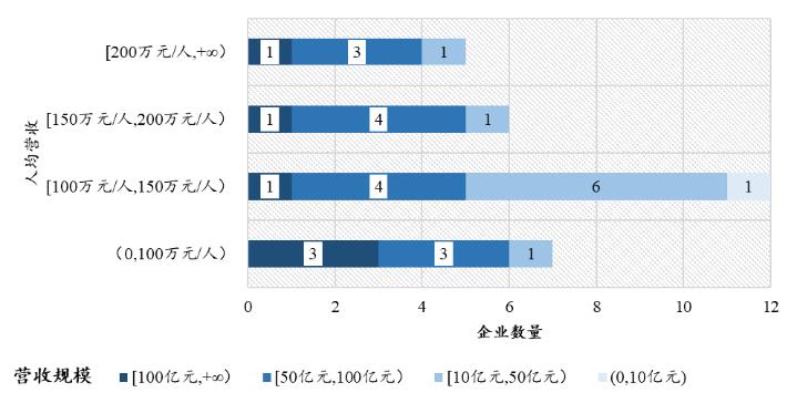在调研的企业中,我们将人均营收分为了4个区间。营收规模大于100亿元的企业人均营收集中在(0,100万元/人)的低人效区间内;营收规模在[50亿元,100亿元)的企业人均营收处于中等水平;而营收规模小于50亿的企业人效处于中下水平。整体来看,在环保行业中,企业营收规模与人均营收这项指标表现优异并无必然关系。